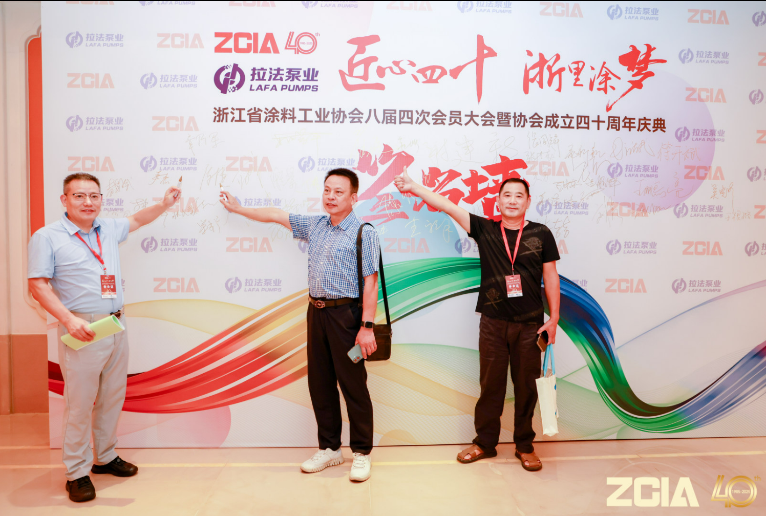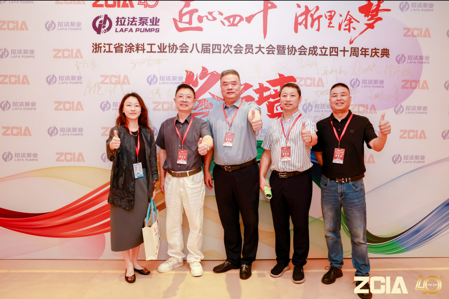 拉法泵业科技(宁波)有限公司总经理姚蓉平先生与企业家们在签到墙前合影、留念。